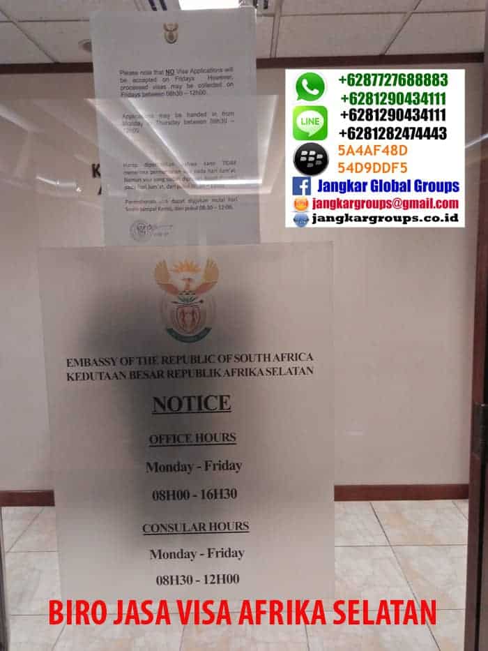 Persyaratan visa bisnis afrika selatan. Kedutaan Afrika selatan hanya menerima permohonan visa dari hari senin sampai kamis jam 08:30 sampai jam 12:00. Kedutaan Afrika selatan tidak menerima permohonan visa pada hari jumat namun visa yang sudah di proses dapat di ambil pada hari jumat jamg 08:30 sampai jam 12:00