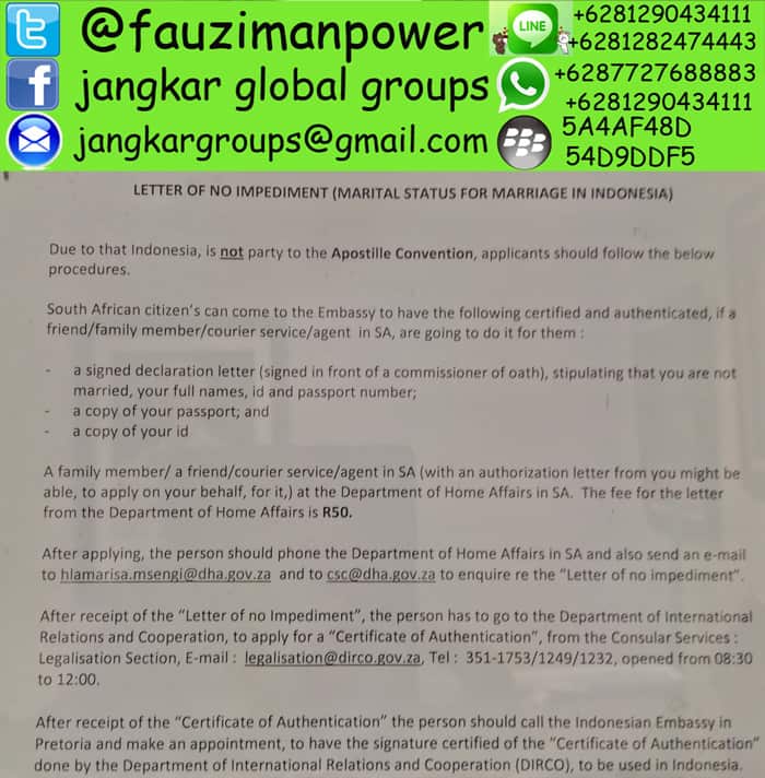Bagi WNI yang akan menikah dengan WNA Afrika selatan di indonesia, inilah persyaratan yang harus di penuhi oleh pihak WNA Afrika sebelum menikah :